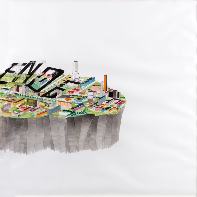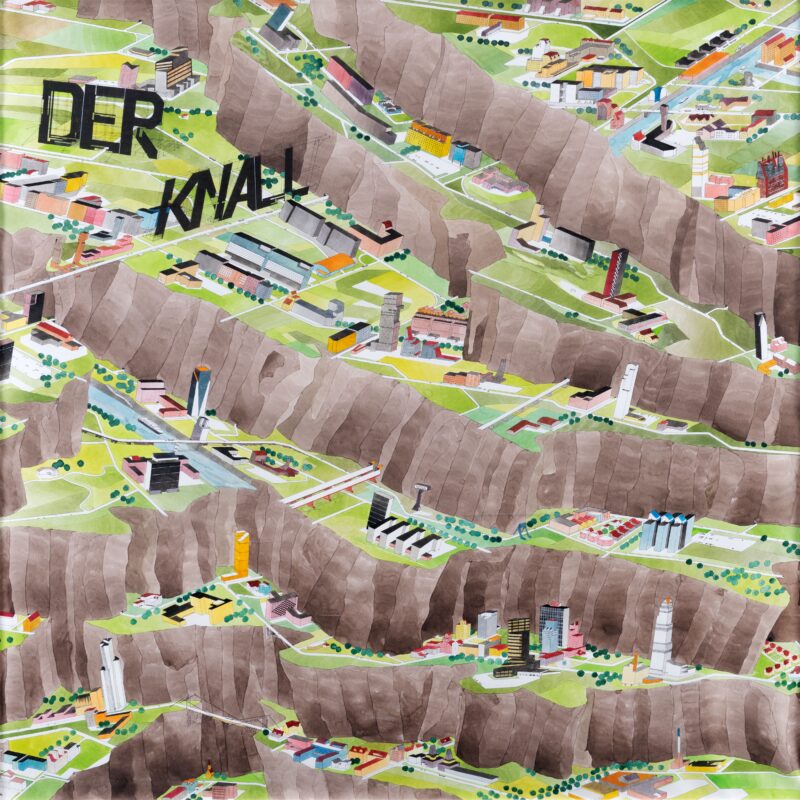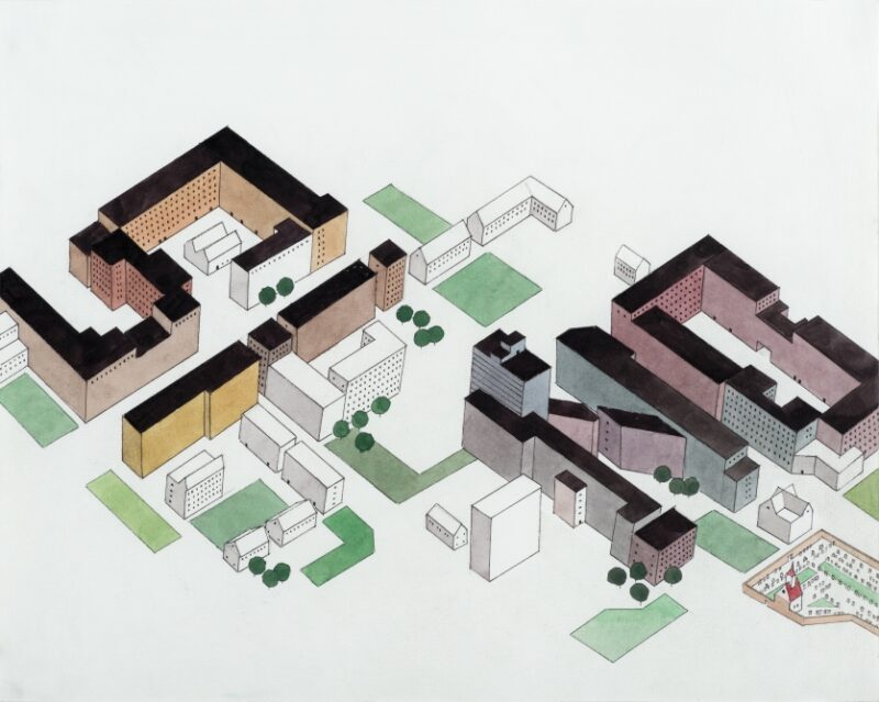 Der aus Norditalien stammende Künstler Siggi Hofer (Bruneck/Südtirol 1970) bedient sich unterschiedlichster Ausdrucksformen und verbindet Malerei, Skulptur, Performance und Video in seinen Arbeiten. Er beschäftigt sich mit gesellschaftlichen Themen und erschafft durch seine Arbeiten neue Denkanstöße und Diskurse und spart nicht mit Gesellschaftskritik. In seinen Stadtansichten und architektonischen Konstrukten führt uns Hofer mit großem Detailreichtum durch Weltmodelle, die teils fiktiv, teils realitätsnah wirken und dabei die Frage nach dem Ideal aufwerfen. Das Auge des Betrachters zieht durch fiktive Wohnblocks, Geschäfte, Fabriken, Häuser, Garagen und stößt auf schriftliche Verweise in großen Lettern, wie „ENDE“, „YES“ oder „NO“, die zum Einen warnend, zum Anderen gut getarnt eine mögliche Entwicklung vorweg nehmen. Hin und wieder finden sich Leerstellen auf dem Papier, die auf eine terra incognita hindeuten. Siggi Hofer war 2006 Preisträger des STRABAG Artaward.