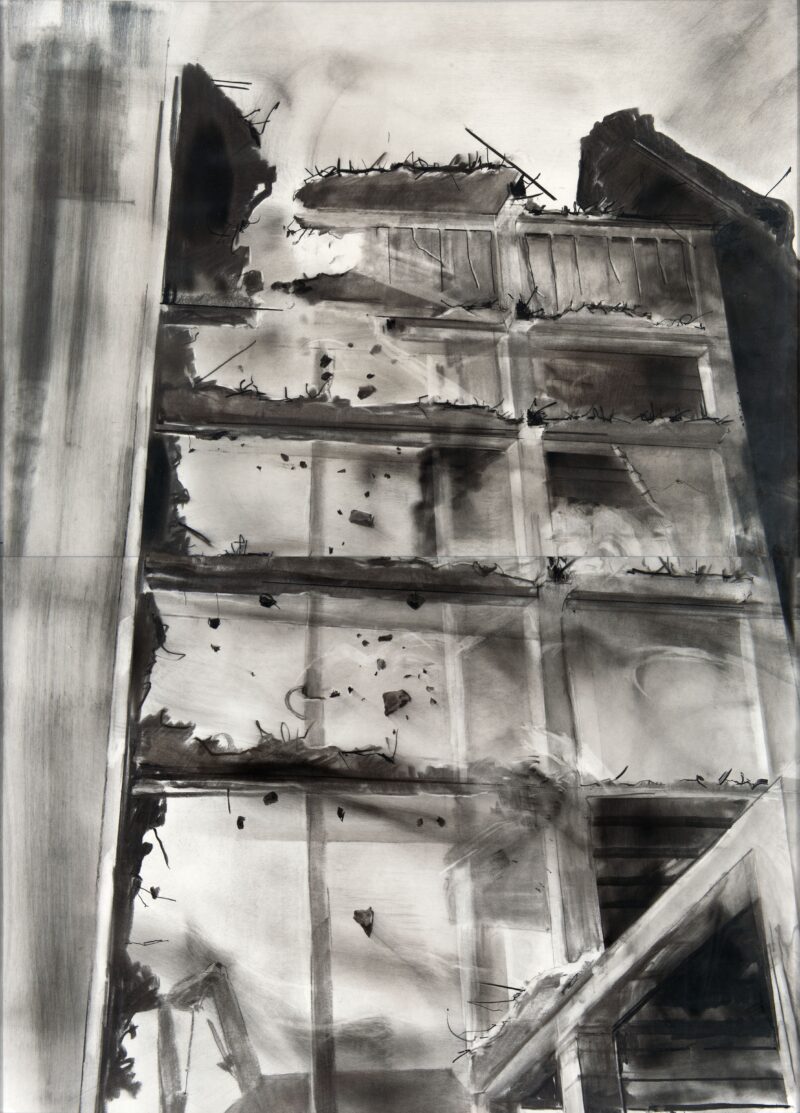 Lucas Horvath, Marienplatz 1, 2010, charcoal on paper, 140 x 200 cm (2-teilig), Photo: STRABAG Kunstforum Lucas Horvath (Salzburg 1969) studied at the University Mozarteum Salzburg and at the Academy of Fine Arts Vienna. Horvath's photographs and charcoal drawings are intensely concerned with the intersection of art and architecture, closely studying construction scaffolding and architectural details as well as the demolition of old, dilapidated buildings. Horvath was inspired to create the Marienplatz series while walking through Munich, witnessing the demolition of a 1960s building in the city center.