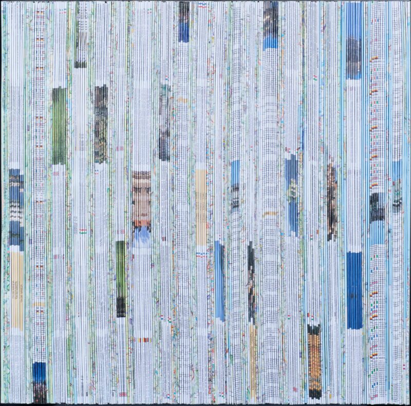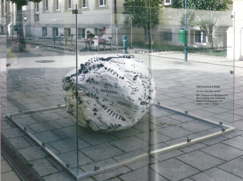 The versatile oeuvre of Michael Kos (Villach 1963) moves between sculpture, installations in public space and conceptual projects. He fixes folded maps on strips of cardboard and arranges them close together to form the works in the series Mappings. The original purpose of the map material is lost in favor of its formal properties such as color, brightness, or structure: the concise information gives way to a new sensuality of this "painting without brushes." As a sculptor, Kos works mainly with Krastal marble and has made a name for himself in particular with his "sewn stones". One work in this series is located in front of the STRABAG building in Graz, another in the STRABAG office building in Villach.