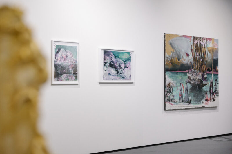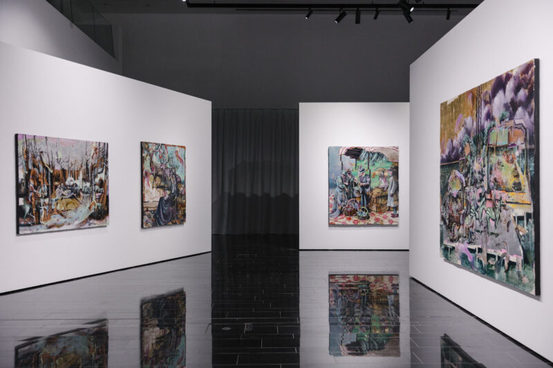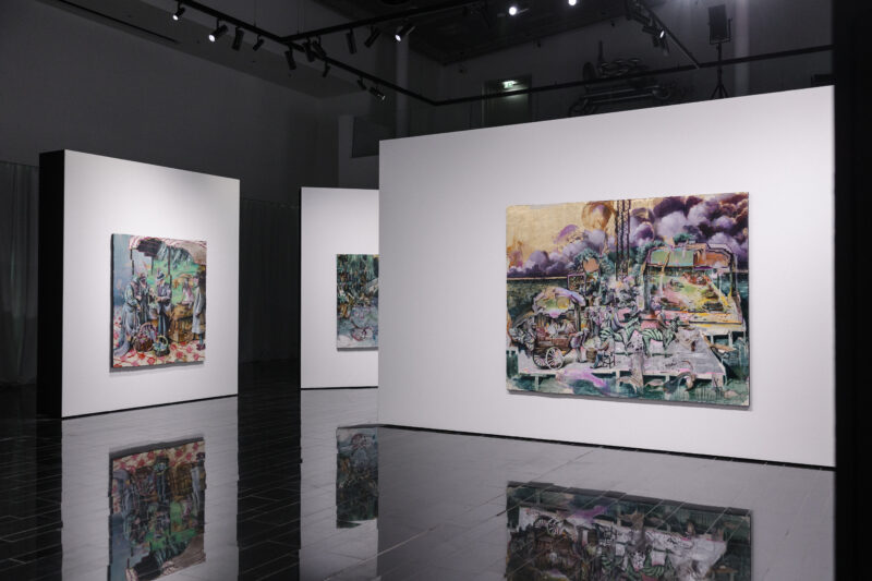 Benjamin Burkards Gemälde entfalten sich als komplexe räumliche Konstruktionen, in denen Figuren und Tiere allmählich aus dichten, abstrakten Farbfeldern hervortreten. Sein Studienhintergrund der Biologie durchdringt diese Kompositionen auf subtile Weise, nicht nur in ihrer präzisen, fast anatomischen Detailtreue, sondern auch in der Art und Weise, wie seine Bildsprache wie ein lebendes System funktioniert. Jede Leinwand wird zu einer visuellen Erzählung, verwoben mit historischen Anspielungen, pixeligen Fragmenten und verschwommenen Gesichtern, die sich oft der Kenntlichkeit entziehen.